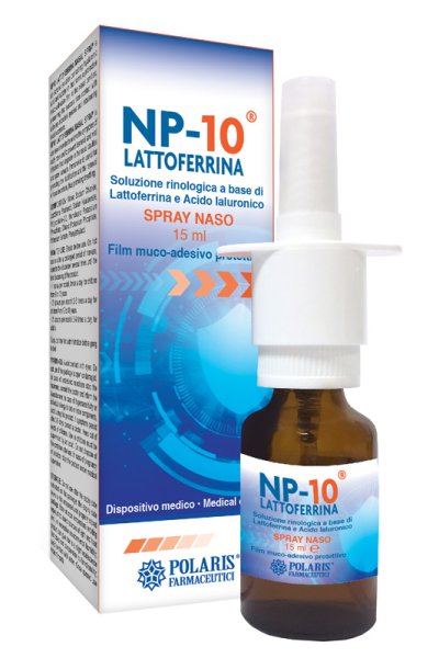 NP-10 Lattoferrina Spray Nasale è soluzione acquosa rinologica a base di acido ialuronico e lattoferrina che, nebulizzata nelle cavità nasali, consente la formazione di un film muco-adesivo protettivo, preservando la mucosa nasale dal contatto con specie microbiche aerodisperse e riequilibrando le secrezioni nasali.