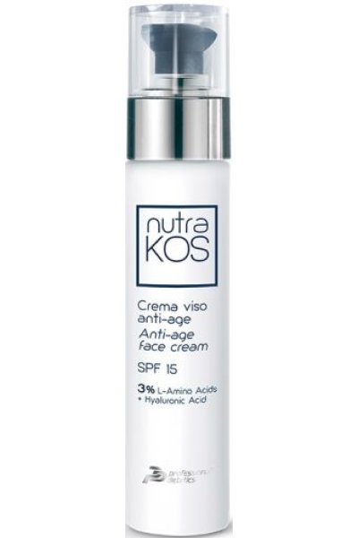 Indicata per le rughe lievi e profonde e per la lassità della pelle. Protegge la pelle dalle radiazioni UV grazie al SPF15 (fattore di protezione 15) e può essere utilizzata tutti i giorni. Nutrakos crema viso anti-age, nella sua formulazione specifica, associa ad aminoacidi ed acido ialuronico un complesso (ketogluconato di calcio) capace di stimolare ulteriormente la sintesi di acido ialuronico ed elastina.