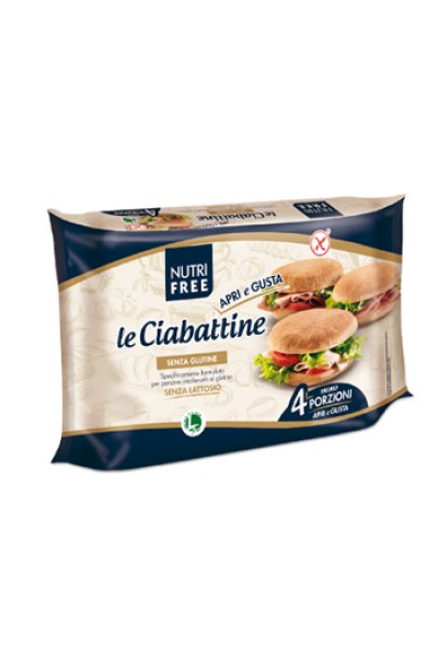 Le Ciabattine, quattro panini morbidissimi in formato monoporzione, buone per accompagnare i pasti, ottime da farcire a piacimento. Le Ciabattine sono naturalmente senza lattosio e senza proteine del latte, garantite e certificate Lfree. Specificamente formulato per persone intolleranti al glutine. Senza latte, OGM, uova, grassi idrogenati. A basso contenuto di zuccheri. Con olio extra vergine di oliva. Con farina di grano saraceno.
