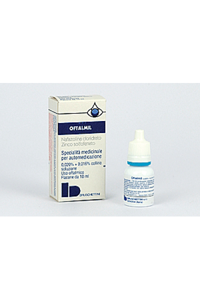 AvvertenzeNon superare la posologia consigliata dal medico.. In caso del persistere od aggravarsi dei sintomi dopo breve periodo di trattamento consultare il medico; in ogni caso il prodotto non deve essere impiegato per più di quattro giorni consecutivi, stante la possibilità che possano verificarsi, in caso contrario, effetti indesiderabili. In caso di: infezioni, pus, corpi estranei nell’occhio, danni meccanici, chimici da calore, consultare il medico. Il prodotto, pur presentando uno scarso assorbimento sistemico, deve essere usato con cautela in pazienti affetti da ipertensione, ipertiroidismo, disturbi cardiaci ed iperglicemia (diabete) e nei soggetti in corso di trattamento con farmaci antidepressivi. Il prodotto, se accidentalmente ingerito o se impiegato per un lungo periodo a dosi eccessive, può determinare fenomeni tossici. Esso va tenuto lontano dalla portata dei bambini poiché l’ingestione accidentale può provocare sedazione spiccata. Oftalmil contiene esteri para idrossi benzoici (metil–p–idrossibenzoato e propil–p– idrossibenzoato) che possono causare fenomeni di ipersensibilità anche ritardata.