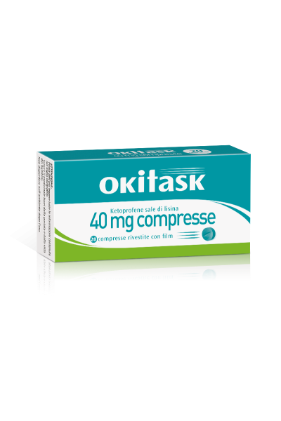 AvvertenzeAvvertenze Gli effetti indesiderati possono essere minimizzati con l’uso della più bassa dose efficace per la più breve durata possibile di trattamento che occorre per controllare i sintomi (vedere i paragrafi sottostanti sui rischi gastrointestinali e cardiovascolari). Cautela deve essere prestata ai pazienti che assumono farmaci concomitanti che potrebbero aumentare il rischio di ulcerazione o emorragia, come corticosteroidi orali, anticoagulanti come warfarin, inibitori selettivi del reuptake della serotonina o agenti antiaggreganti come l’aspirina (vedere paragrafo 4.5). L’uso concomitante di okitask con altri FANS, inclusi gli inibitori selettivi delle cicloossigenasi–2, deve essere evitato. Emorragia gastrointestinale, ulcerazione e perforazione: durante il trattamento con tutti i FANS, in qualsiasi momento, con o senza sintomi di preavviso o precedente storia di gravi eventi gastrointestinali, sono state riportate emorragia gastrointestinale, ulcerazione e perforazione, che possono essere fatali. Negli anziani e in pazienti con storia di ulcera, soprattutto se complicata da emorragia o perforazione (vedere paragrafo 4.3), il rischio di emorragia gastrointestinale, ulcerazione o perforazione è più alto con dosi aumentate di FANS. Questi pazienti devono iniziare il trattamento con la dose più bassa possibile. L’uso concomitante di agenti protettori (misoprostolo o inibitori di pompa protonica) deve essere considerato per questi pazienti e anche per pazienti che assumono in concomitanza basse dosi di aspirina o altri farmaci che possono aumentare il rischio di eventi gastrointestinali (vedere sotto e paragrafo 4.5). Pazienti con storia di tossicità gastrointestinale, specialmente se anziani, devono riferire qualsiasi sintomo addominale (soprattutto sanguinamento gastrointestinale) in particolare nelle fasi iniziali del trattamento. Anziani: i pazienti anziani hanno una frequenza aumentata di reazioni avverse ai FANS, specialmente emorragie e perforazioni gastrointestinali, che possono essere fatali (vedere paragrafo 4.2). Quando si verifica emorragia o ulcerazione gastrointestinale in pazienti che assumono okitask il trattamento deve essere sospeso. Gravi reazioni cutanee alcune delle quali fatali, incluse dermatite esfoliativa, sindrome di Stevens–Johnson e necrolisi tossica epidermica, sono state riportate molto raramente in associazione con l’uso dei FANS (vedere paragrafo 4.8). Nelle prime fasi della terapia i pazienti sembrano essere a più alto rischio: l’insorgenza della reazione si verifica nella maggior parte dei casi entro il primo mese di trattamento. okitask deve essere interrotto alla prima comparsa di rash cutaneo, lesioni della mucosa o qualsiasi altro segno di ipersensibilità. Studi clinici e dati epidemiologici suggeriscono che l’uso di alcuni FANS (specialmente ad alti dosaggi e per trattamenti di lunga durata) può essere associato ad un aumento del rischio di eventi trombotici arteriosi (p. es. infarto del miocardio o ictus). Non sono attualmente disponibili dati sufficienti per escludere un rischio simile per ketoprofene quando esso è somministrato alla dose giornaliera di una compressa, in dose singola, o ripetuta 2–3 volte al giorno. okitask non influisce su diete ipocaloriche o controllate e può essere somministrato anche a pazienti diabetici. Precauzioni Pazienti con ulcera peptica attiva o con storia di ulcera peptica. I FANS devono essere somministrati con cautela nei pazienti con una storia di malattia gastrointestinale (colite ulcerosa, morbo di Crohn) poichè tali condizioni possono essere esacerbate (vedere paragrafo 4.8). All’inizio del trattamento, la funzionalità renale deve essere attentamente monitorata nei pazienti con insufficienza cardiaca, cirrosi e nefrosi, nei pazienti che ricevono una terapia diuretica, in pazienti con compromissione renale cronica, in particolare se i pazienti sono anziani. In questi pazienti, la somministrazione di ketoprofene può provocare una diminuzione del flusso ematico renale causata dall’inibizione delle prostaglandine e portare ad uno scompenso renale. Cautela è richiesta prima di iniziare il trattamento nei pazienti con anamnesi positiva per ipertensione e/o insufficienza cardiaca congestizia da lieve a moderata poiché in associazione al trattamento con i FANS sono stati riscontrati ritenzione di liquidi, ipertensione ed edema. Come per gli altri FANS, in presenza di una infezione, bisogna tenere in considerazione che le proprietà antiinfiammatorie, analgesiche e antipiretiche del ketoprofene possono mascherare i sintomi comuni della progressione dell’infezione come per esempio la febbre. In pazienti con valori della funzione epatica anormali o con storia di malattia epatica, i livelli di transaminasi devono essere valutati periodicamente, specialmente durante la terapia a lungo termine. Con l’uso di ketoprofene, sono stati riferiti rari casi di ittero ed epatite. Per fertilità, gravidanza e allattamento, vedere paragrafo 4.6. I pazienti che presentano asma associata a rinite cronica e allergica, sinusite cronica e/o poliposi nasale sono maggiormente esposti al rischio di allergie all’acido acetilsalicilico e/o ai FANS rispetto al resto della popolazione. La somministrazione di questo medicinale può provocare attacco di asma o broncospasmo, soprattutto nei soggetti allergici all’acido acetilsalicilico o ai FANS (vedere paragrafo 4.3). Pertanto in questi soggetti, nonché in caso di broncopneumopatia ostruttiva cronica o di nefropatia, il prodotto va impiegato soltanto sotto controllo medico. Come per altri FANS, pazienti con ipertensione non controllata, insufficienza cardiaca congestizia, cardiopatia ischemica accertata, malattia arteriosa periferica e/o malattia cerebrovascolare devono essere trattati con ketoprofene soltanto dopo attenta valutazione. Analoghe considerazioni devono essere effettuate prima di iniziare un trattamento di lunga durata in pazi
