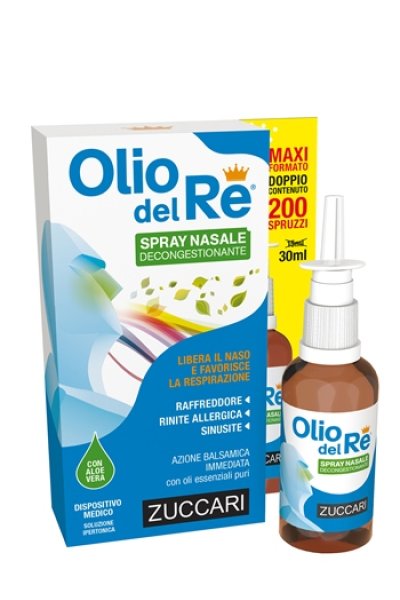 Il prodotto è un dispositivo medico costituito da una soluzione ipertonica a pH fisiologico arricchita con oli essenziali puri e gel d'Aloe vera. Olio del Re è indicato per liberare le fosse nasali, favorendo la respirazione grazie a un'azione combinata fra la soluzione ipertonica, che promuove la fluidificazione del muco in eccesso, l'Aloe, in grado di formare una sottile pellicola con azione idratante-protettiva, e gli oli essenziali, che offrono un'immediata sensazione di sollievo balsamico.