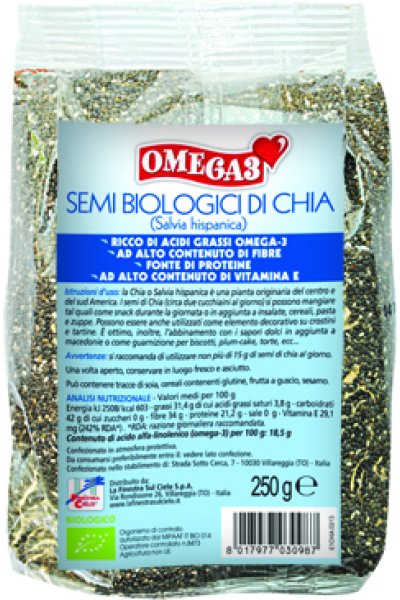 La chia o salvia hispanica è una pianta originaria del centro e del sud America. I semi sono ideali in aggiunta a muesli, cereali, insalate e pasta fredda. Conosciuti ed apprezzati per le numerose proprietà: ricco di acidi grassi Omega-3, ad alto contenuto di fibre e vitamina E, fonte di proteine.