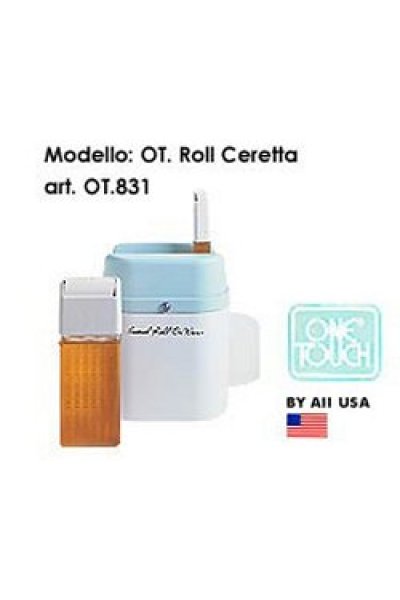 scaldacera termoregolato. Rullo spalma cera che stende un film pre-dosato di prodotto sulla pelle. Rulli di misura per il corpo e per il viso. Dotato di controllo temperatura PTC.