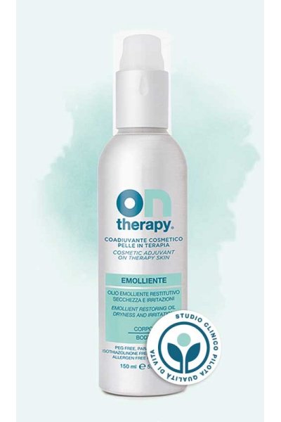 Olio emolliente per la pelle anche in terapia oncologica. Miscela di burri e oli vegetali ristrutturante e intensamente idratante che restituisce alla pelle le sue difese naturali. Grazie al suo effetto rigenerante, nutre la cute e la protegge da secchezza e disidratazione. Ontherapy Emolliente è un ottimo rimedio per la pelle secca o estremamente secca, con desquamazioni e alterazioni delle unghie. Elevata tollerabilità fin dalla nascita - Test Clinico Pediatrico. È utile per il trattamento cosmetico negli stati di stress e secchezza della pelle e delle unghie. Con l'applicazione dell'olio emolliente Ontherapy, la pelle risulta subito nutrita, morbida ed elastica.