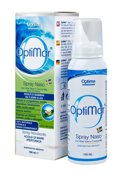 OptiMar Spray Naso con Aloe Vera e Camomilla deterge le cavità nasali rimuovendo polvere, pollini e allergeni, alleviando la congestione nasale associata a sinusiti, febbre da fieno, allergie e cure nasali post operatorie.