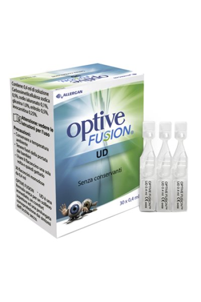 OPTIVE FUSION UD è una soluzione monodose, sterile e senza conservanti contenente carbossimetilcellulosa sodica 0,5%, sodio ialuronato 0,1%, glicerina 1,0%, eritrolo 0,5%, levocarnitina 0,25%, sodio lattato, potassio cloruro, calcio cloruro diidrato, magnesio cloruro esaidrato e acqua depurata.