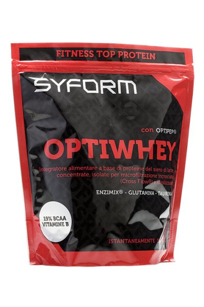 Integratore di proteine, macronutriente essenziale per il trofismo muscolare, con vitamine del gruppo B, indicato nei casi di ridotto apporto con la dieta o di un aumento del fabbisogno di tali nutrienti. Il prodotto si compone di una miscela di proteine del latte costituita da: sieroproteine concentrate (WPC), isolate (WPI) per microfiltrazione incrociata e diafiltrazione (Cross Flow), ed idrolizzate (Optipep 90 DH4). Le tre fonti proteiche garantiscono un elevato standard qualitativo, un elevatissimo valore biologico ed un ampio spettro delle frazioni proteiche del siero. Optiwhey contiene inoltre Enzymix, una miscela di enzimi che aumenta ulteriormente la digeribilità del prodotto, glutamina e taurina che arricchiscono e completano lo spettro aminoacidico. Il contenuto in lattosio è ridotto ed oscilla tra il 2,3-2,5%; il contenuto in aminoacidi ramificati è pari al 19%. Optiwhey presenta un'ottima solubilità ed ha un'elevata digeribilità. Non contiene zucchero (saccarosio) e conservanti aggiunti.