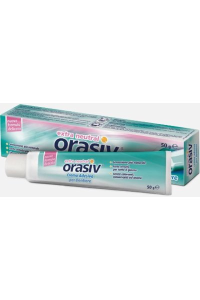 Orasiv Extra Neutral Crema Adesiva fissa ogni tipo di protesi (completa, parziale, provvisoria) creando un forte legame con la gengiva. Mantiene stabile in bocca la dentiera in modo confortevole, limitando sia il rischio di irritazioni, sia le fastidiose infiltrazioni di cibo fra protesi e gengive.