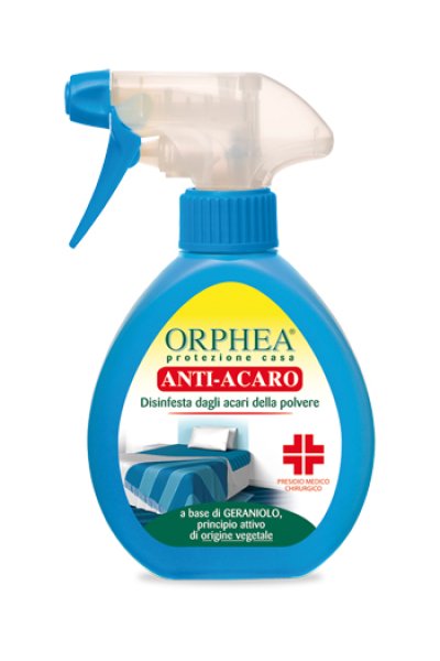 Orphea Anti-Acaro elimina efficacemente gli acari della polvere, origine di importanti allergie alle vie respiratorie. La formulazione è a base di geraniolo, principio attivo di origine vegetale estratto dai fiori di geranio. Il prodotto può essere impiegato nelle camere da letto, negli armadi, su materassi, cuscini, divani, coperte, tappeti, tendaggi e direttamente sugli abiti. È un prodotto utile per disinfestare dagli acari anche l'auto. Per un'azione preventiva dalle allergie si raccomanda la rimozione degli acari mediante l'utilizzo dell'aspirapolvere dopo almeno 1 ora dal trattamento. Non macchia e lascia sui tessuti una delicata profumazione di pulito.