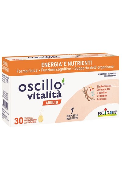 Acidificante: acido citrico; correttore dell’acidità: bicarbonato di sodio; edulcorante: sorbitolo; magnesio bisglicinato, estratto di radice di eleuterococco [Eleutherococcus senticosus (Rupr. Et Maxim.) Maxim], acido L-ascorbico (vitamina C), aroma naturale di arancia, zinco gluconato, L-carnitina L-tartrato; colorante: rosso di barbabietola; ubichinone (coenzima Q10), nicotinamide (vitamina B3); edulcorante: sucralosio; D-pantotenato di calcio (vitamina B5), cianocobalamina (vitamina B12), cloridrato di piridossina (vitamina B6), riboflavina (vitamina B2), mononitrato di tiamina (vitamina B1), acido folico (vitamina B9), D-biotina (vitamina B8).