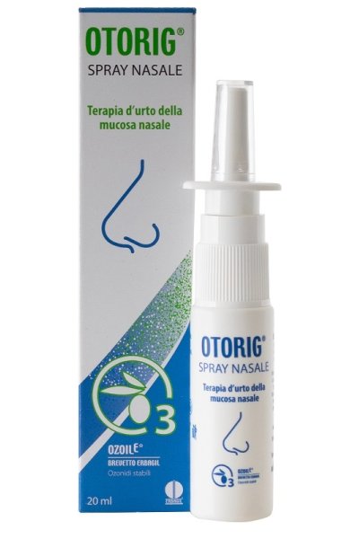 Dispositivo medico protettivo, decongestionante e igienizzante delle cavità nasali, specifico per la prevenzione e il trattamento delle affezioni rinofaringee sia acute che croniche caratterizzate da irritazione, gonfiore, prurito, bruciore, produzione eccessiva di muco. Formula innovativa, è un valido aiuto in caso sindromi influenzali, da raffreddamento, di natura allergica o da inquinanti ambientali e nei postumi operatori in ORL. Otorig spray nasale decongestiona le vie nasali, riduce l’ostruzione e regolarizza le secrezioni promuovendo uno scambio osmotico che favorisce il richiamo di fluidi dalla mucosa e fluidifica il muco facilitandone la rimozione. La sua formulazione con Ozoile mantiene ben idratata la mucosa e svolge un'importante azione igienizzante e protettiva creando un film lipidico mucoadesivo ostile alle alterazioni del microbiota che ripristina il buono stato delle cavità nasali.