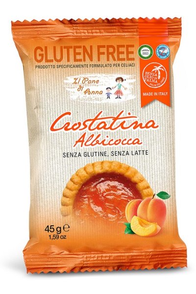 Passata di albicocca 39% [sciroppo di glucosio-fruttosio, zucchero, polpa d’albicocca(23%); gelificante: pectina(E440i); acidificante: acido citrico (E330); conservante: potassio sorbato (E202); estratto vegetale (cartamo, carota), aromi], amido di mais, zucchero, margarina [grassi vegetali (cocco) e oli vegetali (girasole), acqua], farina di riso, uova, farina di mais, destrosio, sale; addensanti: E464, farina di semi di guar; aromi.