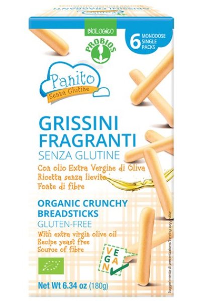 Fragranti grissini confezionati nella pratica busta monodose all'interno del multipack, sono garantiti senza glutine. La ricetta è vegan, fonte di fibre, senza latte e lievito, contiene solo olio extravergine di oliva.