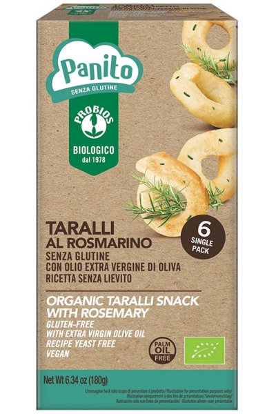 I taralli al rosmarino sono prodotti secondo l'originale ricetta pugliese con olio extra vergine di oliva, senza latte , nè lievito. Biologici, vegan e senza glutine , nella conveniente confezione multipack.