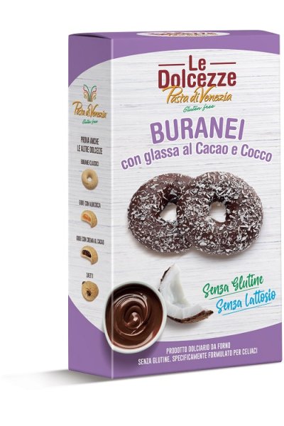 Buranei con glassa al cacao e cocco. Prodotto dolciario da forno, specificamente formulato per celiaci.