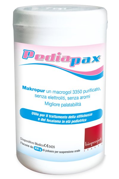 L’efficacia del dispositivo è dovuta alle caratteristiche del polietilenglicole (PEG), polimero ad elevato peso molecolare, metabolicamente inerte, non degradato dalla flora batterica intestinale; sulle lunghe catene polimeriche lineari, mediante legami idrogeno, vengono trattenute le molecole d’acqua, che vanno ad idratare la massa fecale stimolando la peristalsi. Pediapax non viene assorbito a livello intestinale ed è espulso in forma inalterata.