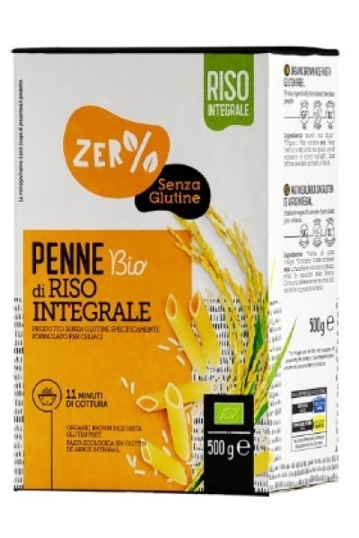 Pasta di riso semigreggio, formato penne senza glutine da agricoltura biologica.Il riso semigreggio è il riso comunemente chiamato integrale, ovvero liberato dalla lolla, il rivestimento più esterno del chicco non commestibile.