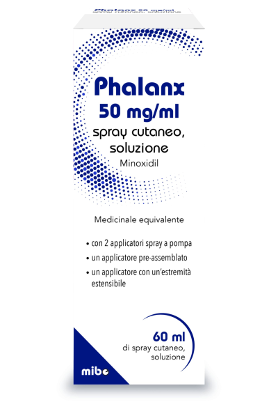 PHALANX 50 mg/ml previene la perdita dei capelli ereditaria in uomini dai 18 ai 65 anni e stimola la crescita dei capelli. Promuove anche la ricrescita di nuovi capelli su punti già debilitati o calvi e ispessisce i capelli esistenti.