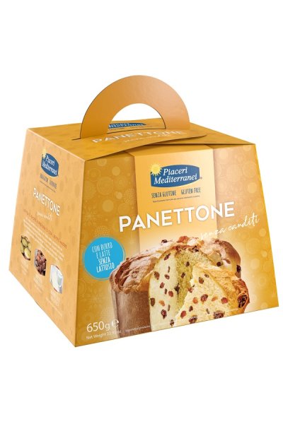 Uvetta 20%, burro delattosato 16%, farina di riso, latte magro delattosato reidratato 13%, tuorlo d’uovo, zucchero, lievito naturale [acqua, amido di mais, farina di riso, sale, fermenti lattici (lactobacillus)], amido di mais, lievito di birra; umidificanti: sorbitolo; addensanti: gomma di xanthan, gomma di guar; emulsionanti: mono e digliceridi degli acidi grassi, aroma, burro di cacao, sale.