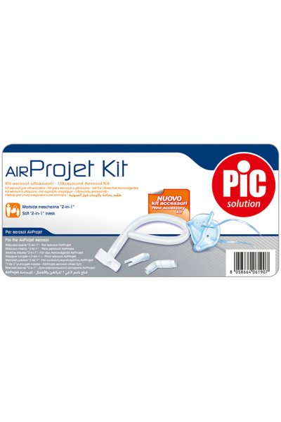 Il kit è al completo, contiene tutti gli accessori per la tua terapia con apparecchi aerosol a ultrasuoni Pic AirProjet Plus: mascherina ergonomica “2 in 1” per le esigenze di tutta la famiglia, un boccaglio, una forcella nasale, un tubo di raccordo.
