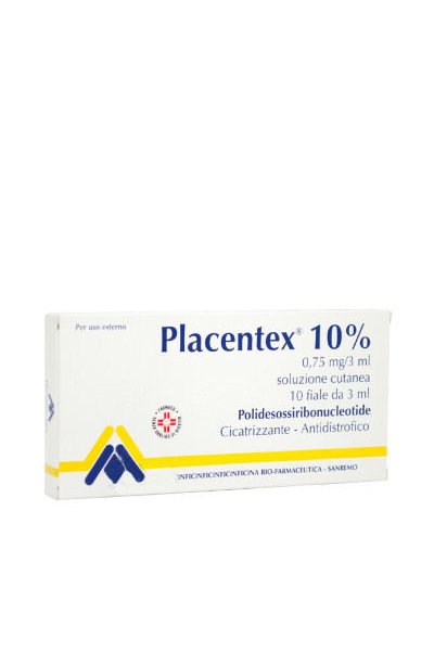 PosologiaPLACENTEX "5.625 mg/3ml soluzione iniettabile", PLACENTEX "2.25 mg/3ml soluzione iniettabile" 1 fiala al dì per via intramuscolare o sottocutanea, per cicli di 15–20 giorni ripetibili o secondo prescrizione medica. PLACENTEX "0.08 % crema" applicazioni locali una o due volte al dì o secondo prescrizione medica. PLACENTEX "0.75 mg/3 ml soluzione cutanea" applicazioni locali 1 o 2 volte al dì, imbibendo garze sterili o secondo prescrizione medica. PLACENTEX "0.75 mg/ml collirio" 2 o 3 gocce nel fornice congiuntivale 2–4 volte al dì o secondo prescrizione medica.