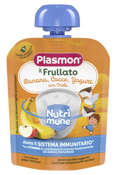 Merenda pastorizzata a base di banana, mela, cocco e yogurt con fermenti lattici pastorizzati.