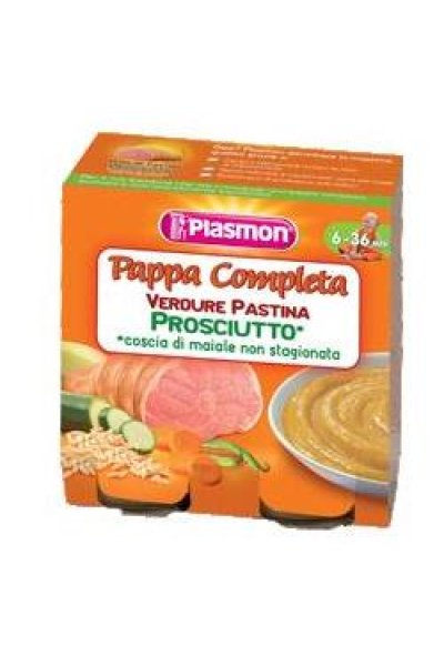 Acqua di cottura; verdure (39%) (carote 15,5%, patate 15,5%, fagiolini 4%, zucchine 4%); prosciutto (8%)*; amido di mais; pastina per infanzia Plasmon tipo Gemmine (3%) [farina di frumento, sali minerali (calcio, ferro), vitamine B1, B2, B6, PP]; olio di girasole; sale.