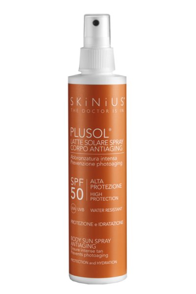 Latte solare spray corpo antiaging SPF 50, con il complesso di Plusolina.