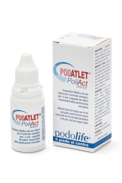 Componente rilevante e frequente della Tinea Pedis (Piede d’Atleta). L’onicomicosi è un’affezione dell’unghia molto comune che colpisce all’incirca il 20% della popolazione; nei pazienti di età superiore ai 60 anni l’onicomicosi raggiunge percentuali molto più elevate, tra il 50 e il 75%. Sono stati individuati numerosi fattori di rischio che predispongono all’onicomicosi; molti di questi fattori sono caratteristici di soggetti anziani (neuropatie periferiche, ischemia, stasi venosa, tromboflebite cronica, diabete, ipertensione, ecc.). Anche nel soggetto giovane e adulto, l’uso crescente di calzature ad insufficiente traspirazione, la frequentazione di arenili infetti, di piscine, di docce, ecc. costituiscono fattori di rischio crescente per le infezioni micotiche dell’unghia. La penetrazione del micete dipende dal grado di reattività dei tessuti dermo-epidermici che compongono l’apparato ungueale (letto ungueale, matrice ungueale, iponichio, ecc.). Tali manifestazioni si accompagnano frequentemente a condizioni di trofismo dell’unghia con alterazione di forma, colore, struttura (onicodistrofia). Le sostanze contenute in PODATLET PoliAct GOCCE, agiscono in maniera sinergica e sincronica sia sul controllo del grado di reattività dei tessuti cutanei e mucocutanei (attraverso precisi meccanismi biologici) equilibrando le naturali difese messe in atto dall’organismo per contrastare la penetrazione e la proliferazione dei miceti; sia sulla normalizzazione del trofismo ungueale. L’Adelmidrol regola l’attività del mastocita dermico; il complesso Acido Undecilenico - Fitosfingosina - Acido Usnico - Triclosan-Bronopol agisce da bio-inibitore della crescita microbica concorrendo, così, a limitare il rischio di onicomicosi; la Biotina e la Vitamina A regolano la differenziazione cheratinocitica; la Polidatina determina effetto antiradicali liberi e l’Urea contrasta l’ispessimento della lamina ungueale.