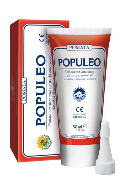 Dispositivo medico CE di classe I.Pomata Populeo, grazie alla sinergia di sostanze vegetali ed oli essenziali in essa contenuti, svolge un'azione lubrificante, emolliente e rinfrescante utile per attenuare i disturbi emorroidali apportando sollievo sin dalle prime applicazioni. Indicata come coadiuvante specifico per il controllo della sintomatologia della sindrome varicosa emorroidaria.
