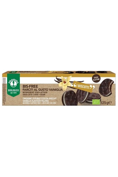 Biscotti biologici al cacao farciti con crema al gusto di vaniglia. Prodotto da forno senza glutine e vegan.