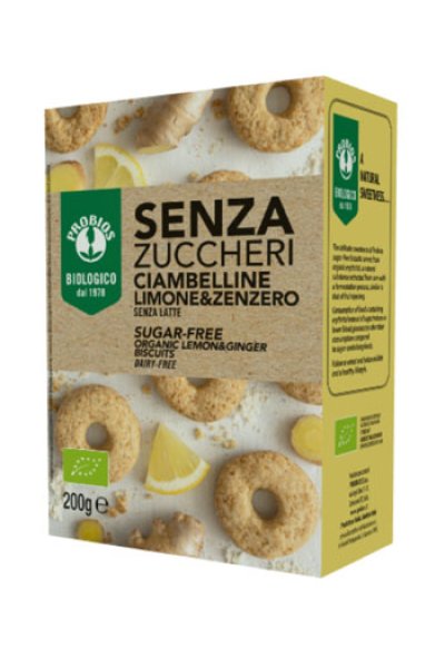 Ciambelline gusto limone e zenzero, senza zuccheri, senza latte. Prodotto da forno con edulcorante. Senza olio di palma.