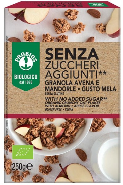 La granola avena e mandorle gusto mela senza zuccheri aggiunti è un nuovo prodotto per la colazione dolcificato con eritritolo che contiene solo gli zuccheri naturalmente presenti. Prodotto vegan.
