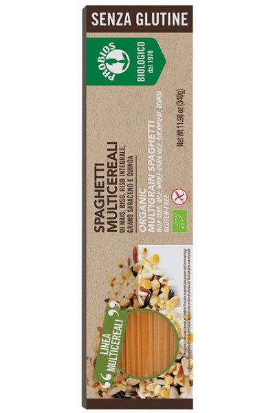 Spaghetti multicereali prodotti con farine biologiche macinate in Italia di mais, riso, riso integrale, grano saraceno, quinoa. Ingredienti