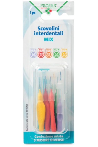 Confezione mista contenente le cinque misure disponibili, codificate con colori distinti per adattarsi a spazi interdentali stretti e più ampi.