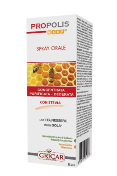 Acqua demineralizzata, estratto glicerinato di propoli tit. 0,3% flavonoidi totali, piantaggine foglie (Plantago lanceolata L.) e.g. D/E 1:2, malva foglie (Malva sylvestris L.) e.g. D/E 1:2, propoli e.s. tit. 2,5% flavonoidi totali, calendula fiori (Calendula officinalis L.) e.g. D/E 1:2, propoli estratto decerato, concentrato e purificato (flavonoidi totali espressi in galangina 41 mg/ml secondo metodo spettrofotometrico), correttore di acidità: acido citrico; emulsionate: polisorbato 80; conservanti: sodio benzoato, potassio sorbato; Menta (Mentha x piperita L.) o.e., pino mugo (Pinus mugo Turra) o.e., eucalipto (Eucalyptus globulus Labill) o.e., edulcorante: glicosidi steviolici da stevia foglie (Stevia rebaudiana Bertoni).