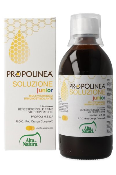 DescrizionePropolinea Soluzione Junior, a base di Propoli M.E.D., Miele d'Acacia, Rosa Canina, R.O.C. (Red Orange Complex) ed Acerola, fonte naturale di Vitamina C, importante per le naturali difese dell'organismo. Con semi di Pompelmo ad azione antiossidante e le 3 specie di Echiancea (Ekina-3) favorenti la funzionalità delle prime vie respiratorie. Arricchito con minerali di Magnesio e Ferro, il complesso vitaminico B (B1, B2, B3, B6, B12), Acido Folico e la Vitamina E importante per la protezione delle cellule dallo stress ossidativo. Aromatizzato con succo di Mandarino.