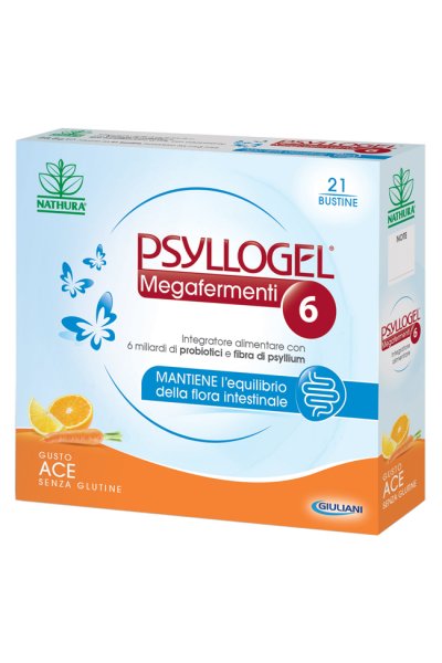 Integratore alimentare simbiotico con 6 miliardi di probiotici e fibra di psyllium pura al 99%, con edulcorante. Psyllogel Megafermenti 6 è utile perché favorisce l'equilibrio della flora batterica intestinale. La fibra di psyllium (Plantago ovata), invece, funge da nutrimento per la flora batterica intestinale, favorendone lo sviluppo. Inoltre, ha la caratteristica peculiare di formare, a contatto con l'acqua, un gel in grado di modulare la consistenza della massa fecale.