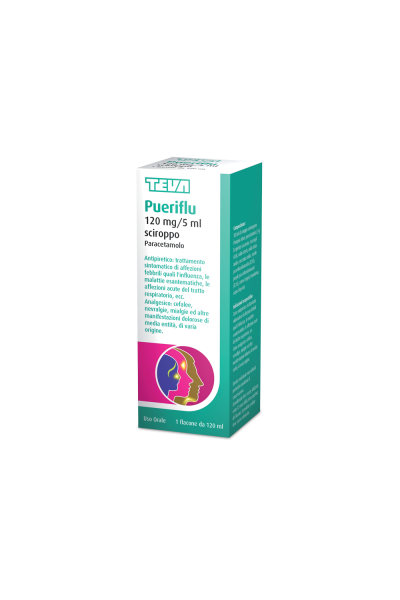 PosologiaPer i bambini è indispensabile rispettare la posologia definita in funzione del loro peso corporeo, e quindi scegliere la formulazione adatta. Le età approssimate in funzione del peso corporeo sono indicate a titolo di informazione. Negli adulti, la posologia massima per via orale è di 3000 mg di paracetamolo al giorno (vedere paragrafo 4.9). Al di sotto dei tre mesi, in caso di ittero, è opportuno ridurre la dose singola per via orale. Il medico deve valutare la necessità di trattamenti per oltre 3 giorni consecutivi. Lo schema posologico di Pueriflu in rapporto al peso corporeo ed alla via di somministrazione è il seguente: Alle confezioni da 120 ml – 200 ml e 240 ml è annesso un bicchiere–dosatore con indicate tacche di livello corrispondenti alle capacità di: 5 ml, 7,5 ml e 10 ml. Pueriflu 120 mg/5 ml sciroppo– flacone 120 ml Pueriflu 120 mg/5 ml sciroppo– flacone 200 ml Pueriflu 120 mg/5 ml sciroppo– flacone 240 ml • Bambini di peso compreso tra 7 e 10 kg (approssimativamente tra i 6 ed i 18 mesi): 5 ml alla volta (corrispondenti a 120 mg di paracetamolo), da ripetere se necessario dopo 6 ore, senza superare le 4 somministrazioni al giorno. • Bambini di peso compreso tra 11 e 12 kg (approssimativamente tra i 18 ed i 24 mesi): 5 ml alla volta (corrispondenti a 120 mg di paracetamolo), da ripetere se necessario dopo 4 ore, senza superare le 6 somministrazioni al giorno. • Bambini di peso compreso tra 13 e 20 kg (approssimativamente tra i 2 ed i 7 anni): 7,5 – 10 ml alla volta (corrispondenti rispettivamente a 180 e 240 mg di paracetamolo), da ripetere se necessario dopo 6 ore, senza superare le 4 somministrazioni al giorno. • Bambini di peso compreso tra 21 e 25 kg (approssimativamente tra i 6 ed i 10 anni): 10 ml alla volta (corrispondenti a 240 mg di paracetamolo), da ripetere se necessario dopo 4 ore, senza superare le 6 somministrazioni al giorno. • Bambini di peso compreso tra 26 e 40 kg (approssimativamente tra gli 8 ed i 13 anni): 15 – 20 ml alla volta (corrispondenti rispettivamente a 360 e 480 mg di paracetamolo), da ripetere se necessario dopo 6 ore, senza superare le 4 somministrazioni al giorno. • Ragazzi di peso compreso tra 41 e 50 kg (approssimativamente tra i 12 ed i 15 anni): 20 ml alla volta (corrispondenti a 480 mg di paracetamolo), da ripetere se necessario dopo 4 ore, senza superare le 6 somministrazioni al giorno. • Ragazzi di peso superiore a 50 kg (approssimativamente sopra i 15 anni): 20 ml alla volta (corrispondenti a 480 mg di paracetamolo), da ripetere se necessario dopo 4 ore, senza superare le 6 somministrazioni al giorno. • Adulti: 20ml alla volta (corrispondenti a 480 mg), da ripetere se necessario dopo 4 ore, senza superare le 6 somministrazioni al giorno. 120 mg/5 ml sciroppo – 10 contenitori monodose 5 ml• Bambini di peso compreso tra 7 e 10 kg (approssimativamente tra i 6 ed i 18 mesi): 1 contenitore da 5 ml (corrispondenti a 120 mg di paracetamolo), da ripetere se necessario dopo 6 ore, senza superare le 4 somministrazioni al giorno. • Bambini di peso compreso tra 11 e 12 kg (approssimativamente tra i 18 ed i 24 mesi): 1 contenitore da 5 ml (corrispondenti a 120 mg di paracetamolo), da ripetere se necessario dopo 4 ore, senza superare le 6 somministrazioni al giorno. 120 mg/5 ml sciroppo – 10 contenitori monodose 10 ml • Bambini di peso compreso tra 21 e 25 kg (approssimativamente tra i 6 ed i 10 anni): 1 contenitore da 10 ml (corrispondenti a 240 mg di paracetamolo), da ripetere se necessario dopo 4 ore, senza superare le 6 somministrazioni al giorno. • Ragazzi di peso compreso tra 41 e 50 kg (approssimativamente tra i 12 ed i 15 anni): 2 contenitori da 10 ml (pari a 20 ml – corrispondenti a 480 mg di paracetamolo), da ripetere se necessario dopo 4 ore, senza superare le 6 somministrazioni al giorno. • Ragazzi di peso superiore a 50 kg (approssimativamente sopra i 15 anni): 2 contenitori da 10 ml (pari a 20 ml – corrispondenti a 480 mg di paracetamolo), da ripetere se necessario dopo 4 ore, senza superare le 6 somministrazioni al giorno. Insufficienza renale In caso di insufficienza renale grave (clearance della creatinina inferiore a 10 ml/min), l’intervallo tra le somministrazioni deve essere di almeno 8 ore. Per le istruzioni sulla manipolazione del medicinale vedere paragrafo 6.6.