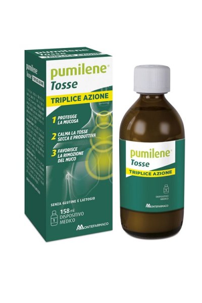 Pumilene Tosse TRIPLICE AZIONE calma la tosse secca e produttiva, inoltre è un utile coadiuvante per la protezione delle vie respiratorie in quanto, creando una barriera mucoadesiva, limita il contatto con gli agenti irritanti ed i microrganismi patogeni.