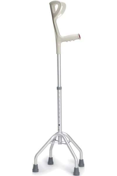 Quadripode base larga con appoggio brachiale, impugnatura anatomica. Interamente realizzato in alluminio leggero verniciato. Puntali antiscivolo in gomma morbida. Regolabile in altezza da 76 a 98 cm.