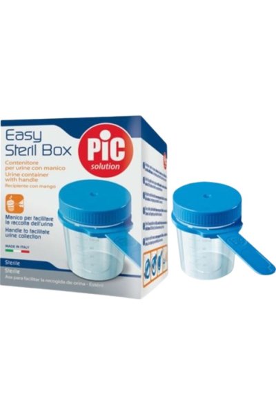 È un pratico contenitore per urina dotato di manico. Si può usare per raccogliere comodamente i fluidi organici necessari per le analisi. Permette di raccogliere le urine in modo pratico e igienico, senza fuoriuscite. Utilizzarlo in autonomia per le analisi o per semplificare la raccolta dell'urina dei bambini o di chi non è più autosufficiente. La scala graduata da 20 a 100ml consente di verificare la quantità esatta raccolta e l'etichetta adesiva aiuta nell'identificazione del campione. Easy Steril Box è sterile e monouso, ma la sua particolarità è il pratico manico per facilitare la raccolta dell'urina. Il prodotto è disponibile in un solo formato dalla capacità di 100ml, in confezione singola sigillata. In ogni confezione è presente l'etichetta adesiva da compilare e da applicare al bicchierino, per identificare più facilmente il campione.