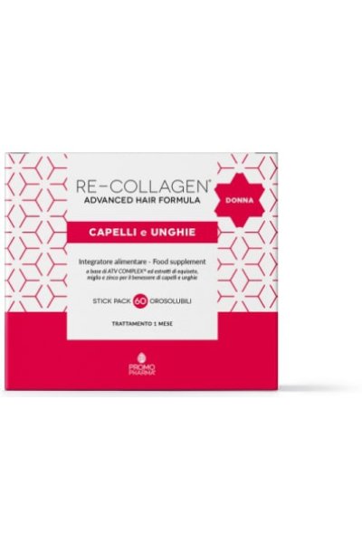 Re-Collagen capelli e unghie donna è un integratore alimentare con aminoacidi, vitamine ed estratti vegetali come equiseto, miglio, zinco e biotina, che contribuiscono al mantenimento di capelli normali e con rame per la normale pigmentazione dei capelli. Equiseto, miglio e zinco contribuiscono anche al mantenimento di unghie normali.