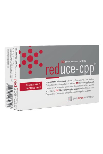 Palmitoiletanolamide, epigallocatechingallato 50% da [Camellia sinensis (L.) Kuntze], curcuminoidi da Curcuma longa L.; agenti di carica: cellulosa microcristallina, calcio fosfato bibasico; agente antiagglomerante: carbossimetilcellulosa sodica reticolata; agenti di rivestimento: amido pregelatinizzato, talco, gommalacca, glicerolo; capsico frutti (Capsicum annuum L.) e.s. tit. 2% capsaicina; colorante: biossido di titanio; agenti antiagglomeranti: biossido di silicio, sali di magnesio degli acidi grassi.