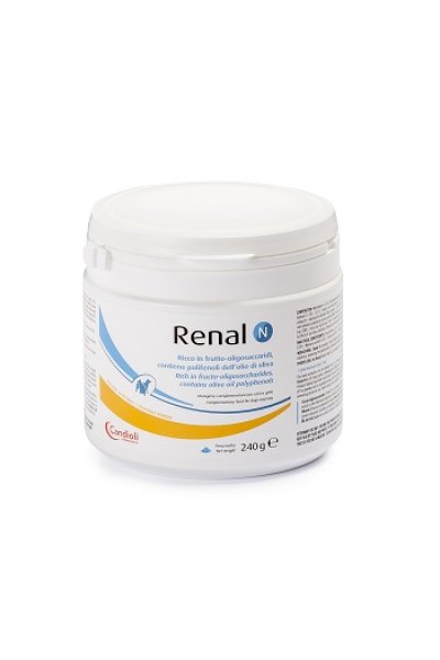 Renal N apporta fruttoligosaccaridi, polifenoli dell'olio di oliva, Enterococcus faecium e vitamine che favoriscono il mantenimento del normale metabolismo e di una idonea funzionalità intestinale.