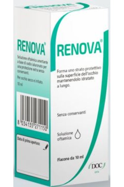 RENOVA è concepito per proteggere l'occhio per un lungo periodo grazie alla composizione contenente un'alta concentrazione di sodio ialuronato e levo-carnitina. Grazie alla sua formulazione RENOVA aiuta a lenire i sintomi dell'irritazione oculare, occhio secco, sensazioni di bruciore e di corpo estraneo causati da fattori ambientali quali vento, sole, aria secca, acqua salata, luce eccessiva, aria condizionata, calore, uso prolungato del computer, congiuntivite, uso prolungato o frequente delle lenti a contatto, operazionidi chirurgia oftalmica.