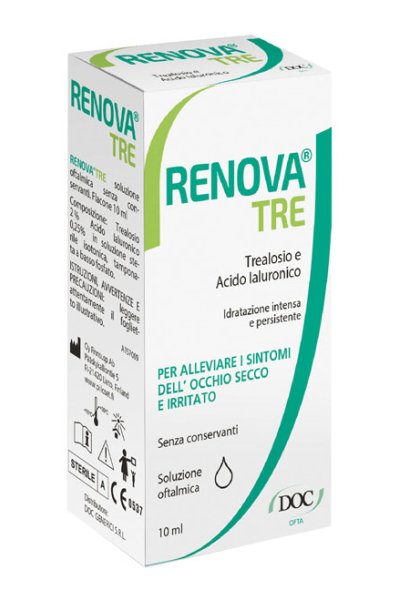 Collirio idratante dall'azione intensiva, adatto per alleviare i sintomi gravi e moderati degli occhi secchi. Grazie all'azione combinata di trealosio e acido ialuronico Renova Tre idrata, lubrifica, ripristina a lungo il film lacrimale. Il dispositivo medico è utilizzabile anche in caso di lenti a contatto. Senza conservanti. Il collirio è adatto in caso di occhi sensibili anche indossando lenti a contatto. L'uso regolare allevia i sintomi degli occhi secchi, prurito, bruciore e sensazione di corpo estraneo, causati da fattori ambientali quali aria secca, vento, fumo, inquinamento atmosferico, luce eccessiva, chirurgia oculare e uso di lenti a contatto.