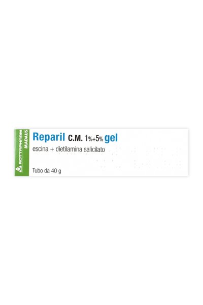 (*) C.M.: composizione modificata per eliminazione di un principio attivo (eparina sodica). REPARIL C.M. 1% + 5% gel 100 g di gel contengono: Principi attivi: Escina 1 g Dietilamina salicilato 5 g REPARIL C.M. 2% + 5% gel 100 g di gel contengono: Principi attivi: Escina 2 g Dietilamina salicilato 5 g Per l’elenco completo degli eccipienti vedere, paragrafo 6.1