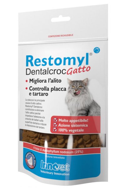 Supporto nutrizionale per la salute del cavo orale dei gatti. Previene la formazione e l'adesione della placca sulla superficie dentaria, migliorando l'alito e rallentando la deposizione del tartaro. A differenza di altre misure per il controllo della placca, Restomyl Dentalcroc agisce per via sistemica. Contiene infatti una particolare alga bruna (Ascophyllum nodosum), il cui uso è stato brevettato e i cui benefici sulla salute del cavo orale sono stati dimostrati specificatamente nell'animale da compagnia*. L'alga bruna viene assorbita dopo somministrazione orale e, attraverso la circolazione, raggiunge le ghiandole salivari per concentrarsi nella saliva. Qui impedisce la crescita sulla superficie dentaria della componente batterica della placca e riduce la deposizione del tartaro. Il primo segno di un miglioramento della salute orale è la scomparsa dell'alito cattivo. Restomyl Dentalcroc non contiene alcun ingrediente che maschera il cattivo odore dell'alito.